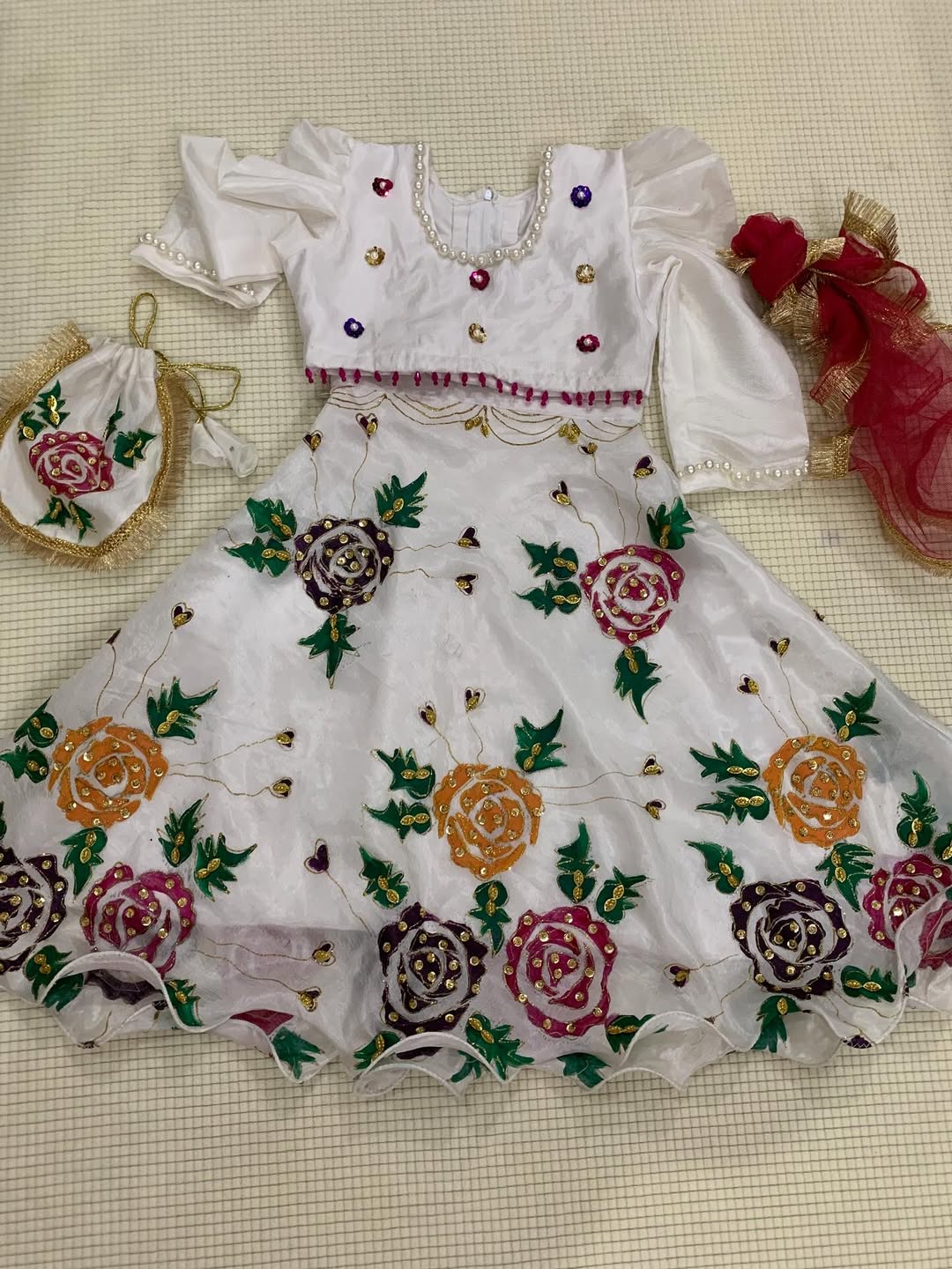 Make your special day even more memorable with this exquisite hand-painted lehenga in elegant off-white. Adorned with unique floral artwork and delicate embellishments, this piece is a true blend of tradition and modern grace.