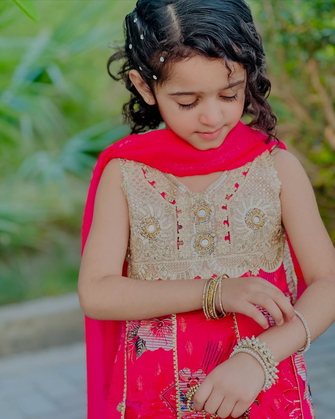 Bring style and elegance to your little one’s wardrobe with our vibrant shocking pink dress adorned with intricate gold bindi work. The flared, flowy silhouette with layered kalis adds beautiful movement and charm, making it perfect for weddings, birthdays, or any special celebration. This dress blends tradition with modern flair, ensuring your princess stands out in every event.